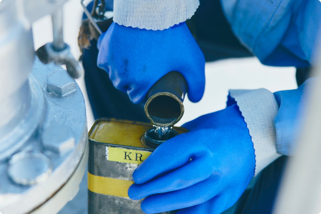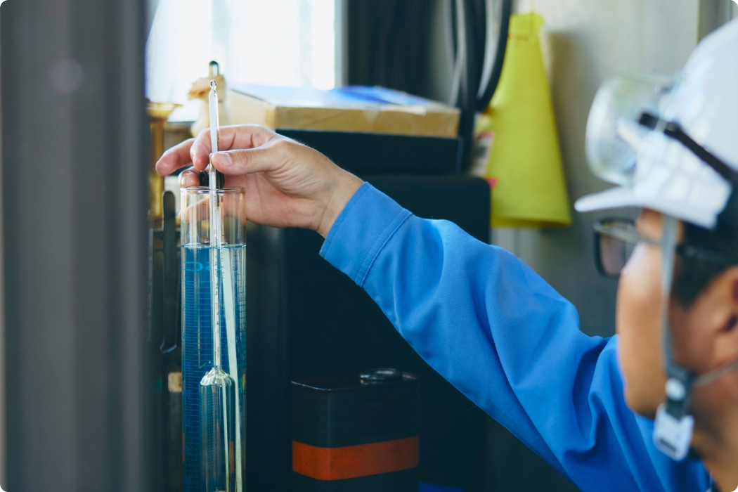 陸上タンクの製品を定期的にサンプル採取し、外観(不純物・色相)、水分検査、密度のチェックを行います。