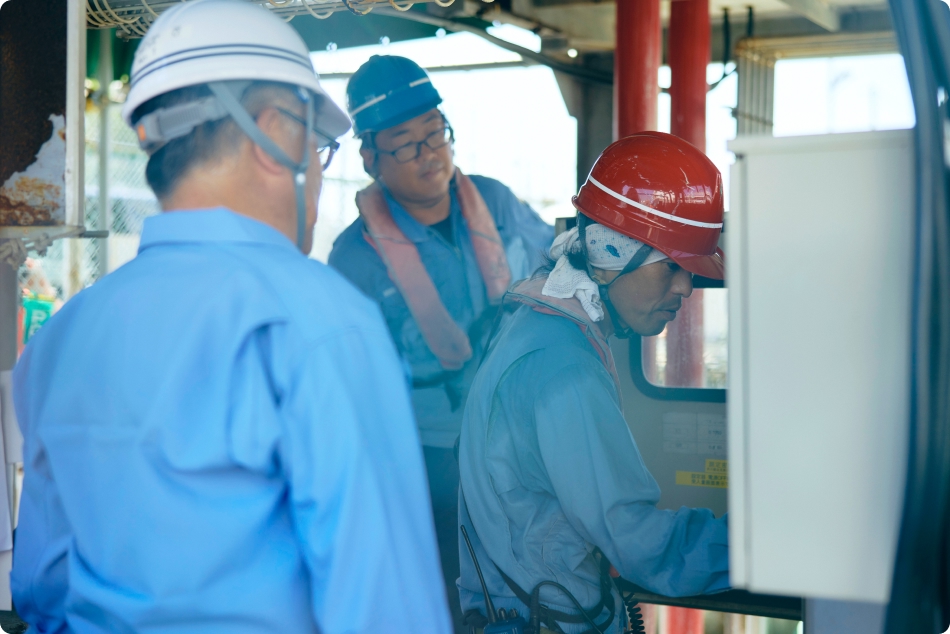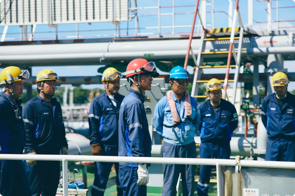 着桟後、受け入れ数量やタンク切り替え、緊急対応などのミーティングを実施します。
