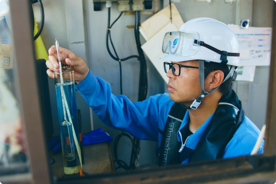 現場は救命胴衣を着用し、桟橋へ向かい点検やサンプル採取の準備をします。