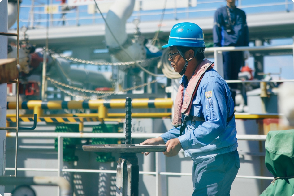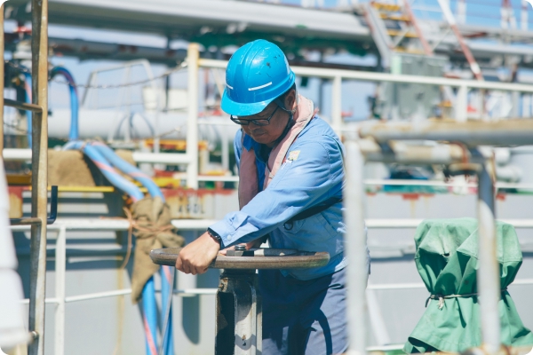 荷役前に油種を確認し、バルブを開放してポンプを起動します。