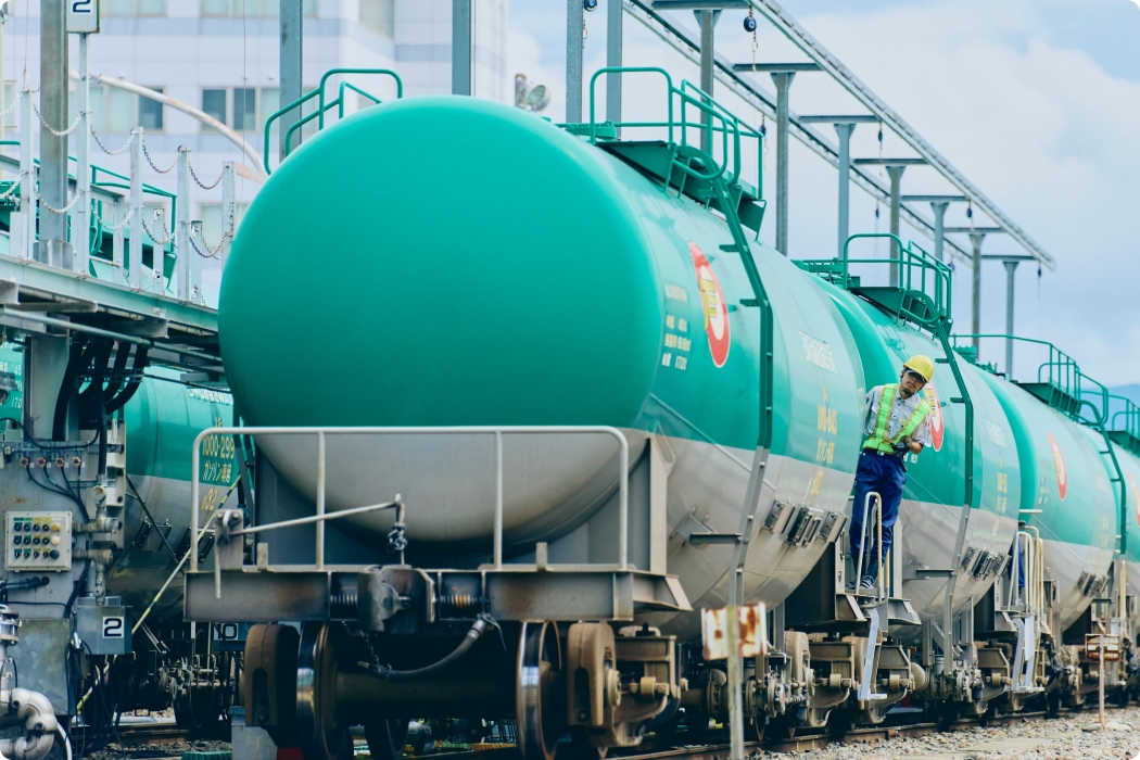 松本油槽所では、タンク貨車による製品の受け入れも行っており、1両あたり約50KLを積載できるタンク車14両編成を、1日あたり2~3回受け入れています。安定供給を維持するため、通常は日曜日を除いて毎日受け入れを実施し、繁忙期には日曜日も含めて受け入れを行っています。